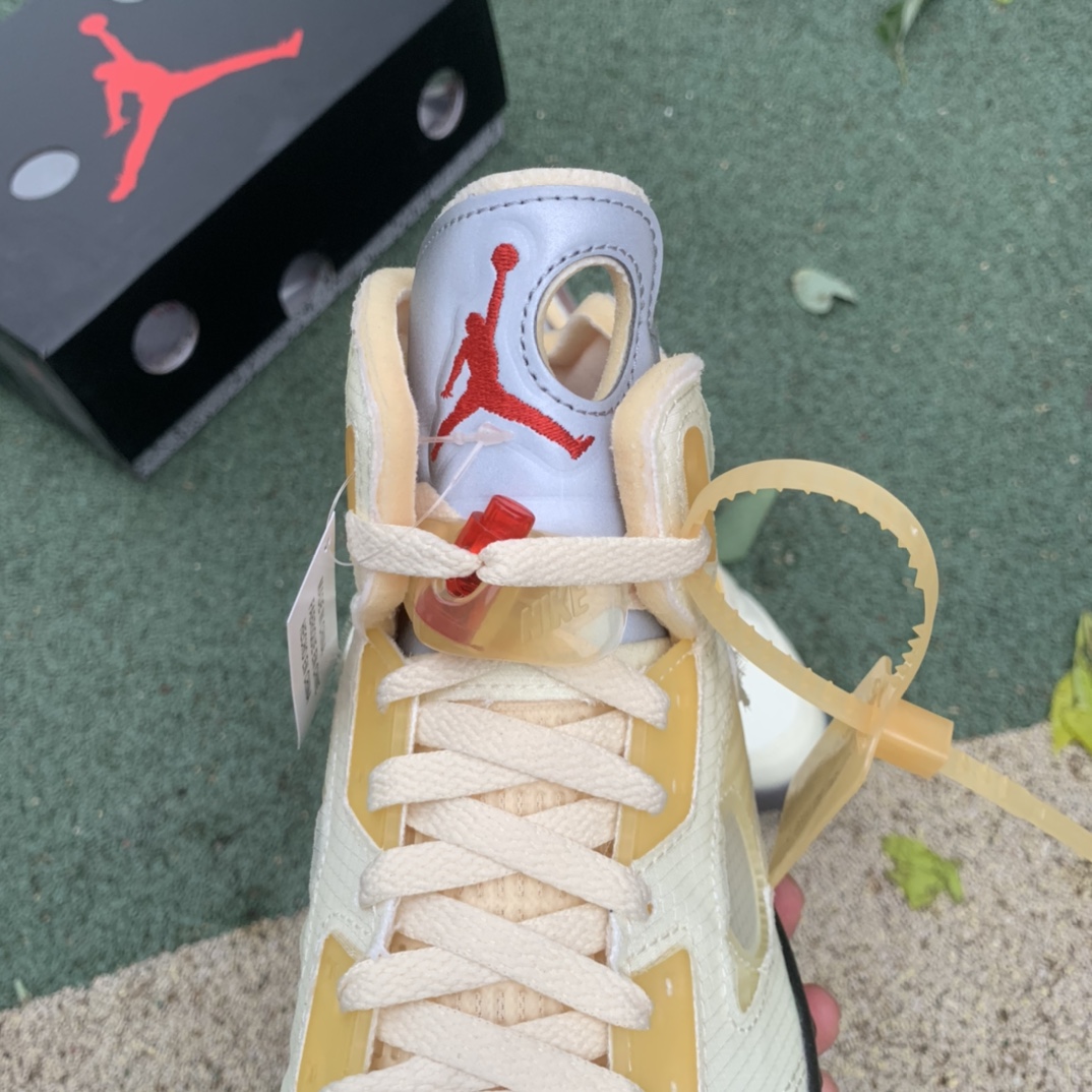 버질 아블로(Virgil Abloh)의 럭셔리 스트리트웨어 브랜드와 콜라보레이션한 오프화이트 x 에어 조던 5 레트로 SP '세일(Sail)'은 2020년 초 파트너 브랜드의 블랙 AJ5의 후속 제품이다. 중간발, 칼라 및 반사되는 은색 설포에 원형 컷아웃으로 완성된 미묘한 크림색 마감. 측면 측면 패널의 인쇄된 Helvetica 텍스트를 포함하여 Virgil의 시그니처가 번성하여 '23'을 보완하고 뒤꿈치의 Nike Air 브랜딩을 보완합니다. 사전 노란색으로 처리된 반투명 밑창이 스니커즈의 빈티지 미학을 더해줍니다