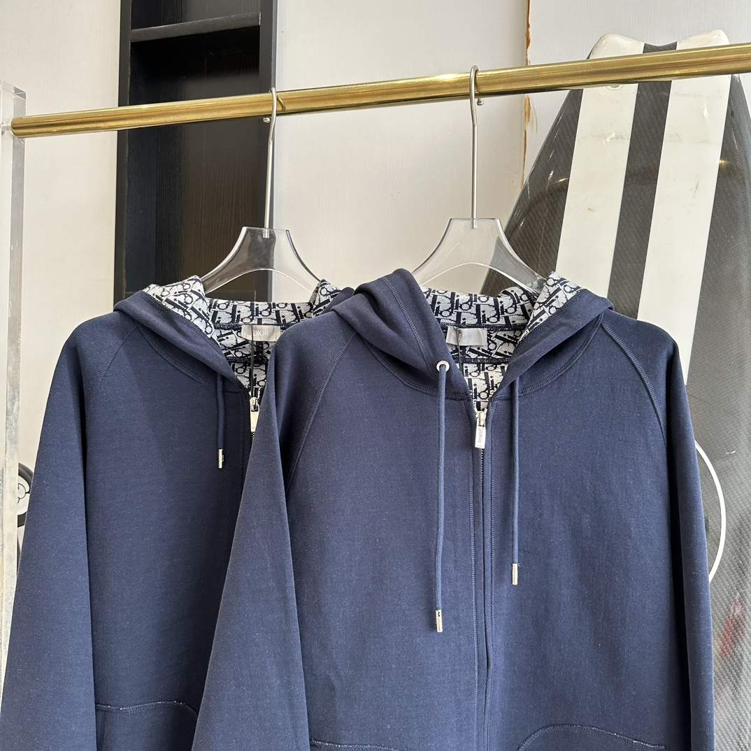 후드와 지퍼 클로저, 래글런 슬리브로 구성된 스타일로 앞면 Dior 자수와 내부 올오버 Dior Oblique 자카드 장식이 특징입니다.